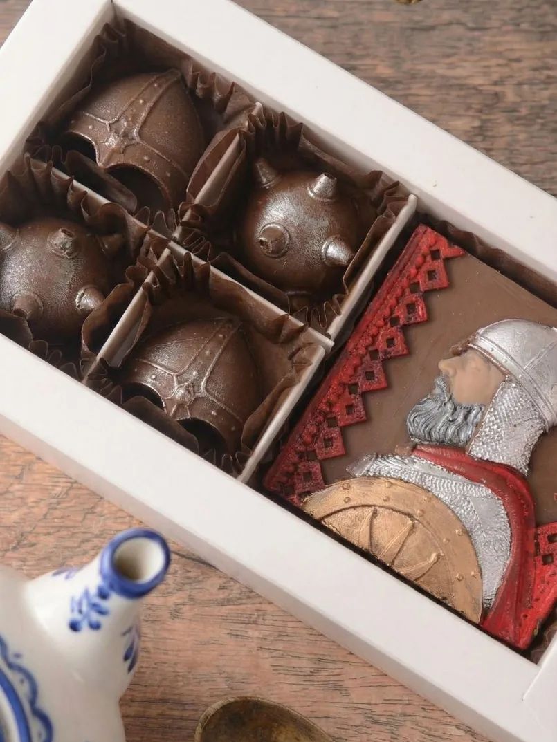 Композицию возглавляет стилизованная плитка с рельефным изображением былинного воина. Её сопровождают четыре уникальные конфеты, отлитые в форме атрибутов доблести: два величественных шлема и две могучие булавы. Каждый предмет отличается чётко проработанными деталями, превращая набор в миниатюрное произведение кондитерского искусства.